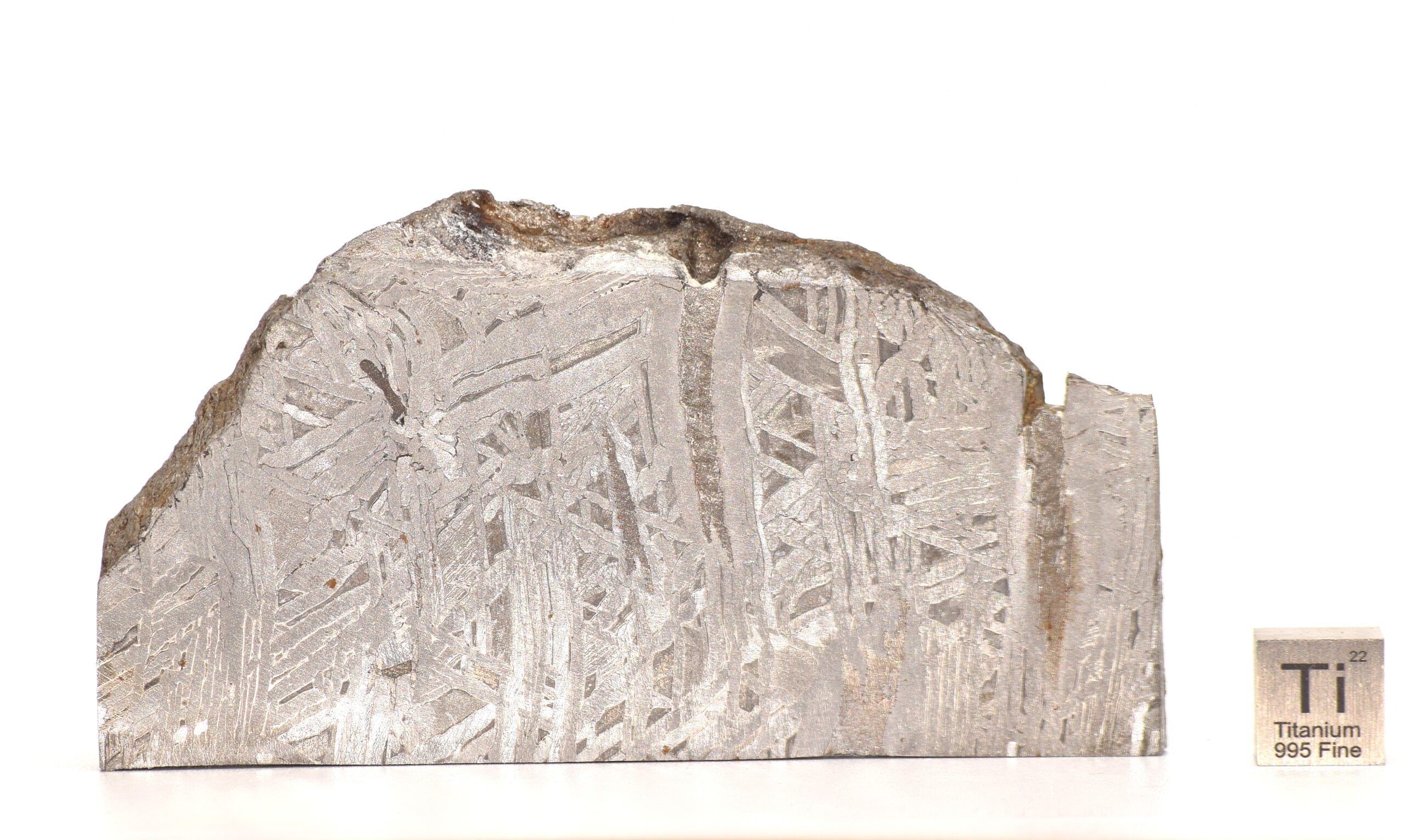 The Aletai iron meteorite is a classic octahedrite with its characteristic internal metallic structures and belongs to the IIIE-an chemical group, indicating a moderate nickel content and a typical iron-nickel composition dominated by kamacite and taenite. Its octahedrite structure reflects slow cooling within the metallic core of a differentiated asteroid, allowing the formation of large, interleaved metallic crystals. The Widmanstätten pattern visible in this slice provides insight into the cooling rate and crystallization history of the parent body. Trace elements such as gallium, germanium, and iridium can be used to confirm its classification and provenance. The slice’s polished surface reveals the metallographic texture, making it suitable for scientific study and comparison with other IIIE-an specimens.