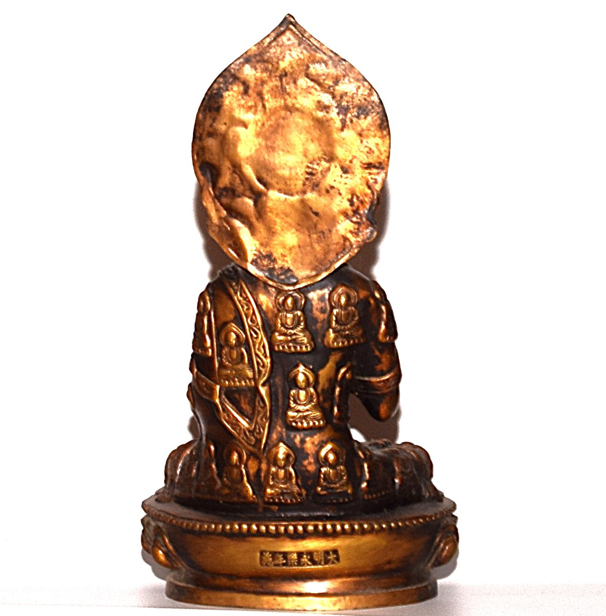 The sculpture is very well preserved, measuring approximately 31 cm in height, 18 cm in width, and 10 cm in depth at the base, and weighing approximately 2.85 kg. The bronze surface shows a warm patina with subtle traces of gilding, consistent with 20th-century Chinese devotional bronzes. An inscription on the reverse further enhances its authenticity and decorative appeal.