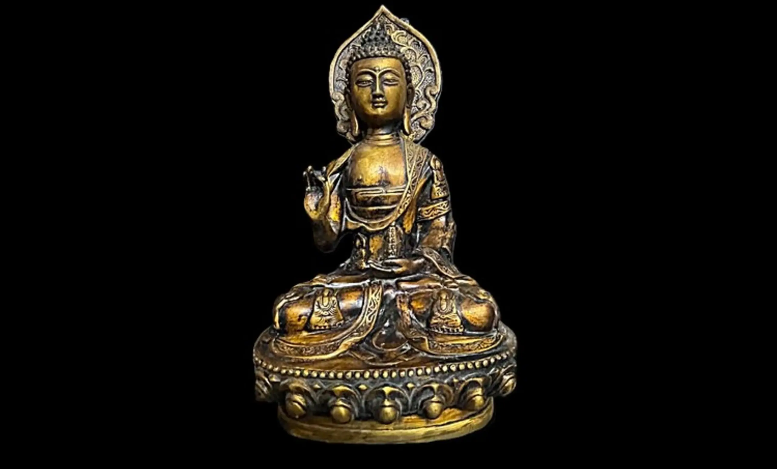 This 20th-century Chinese bronze Buddha is exquisitely cast, its intricate detailing and serene presence exemplifying traditional Chinese Buddhist craftsmanship. Seated in dhyāna posture upon a double lotus base and backed by an ornamental aureole, the figure conveys both devotional intent and refined artistry. The right hand is raised in Vitarka mudra (gesture of teaching or discussion), symbolizing the transmission of wisdom.