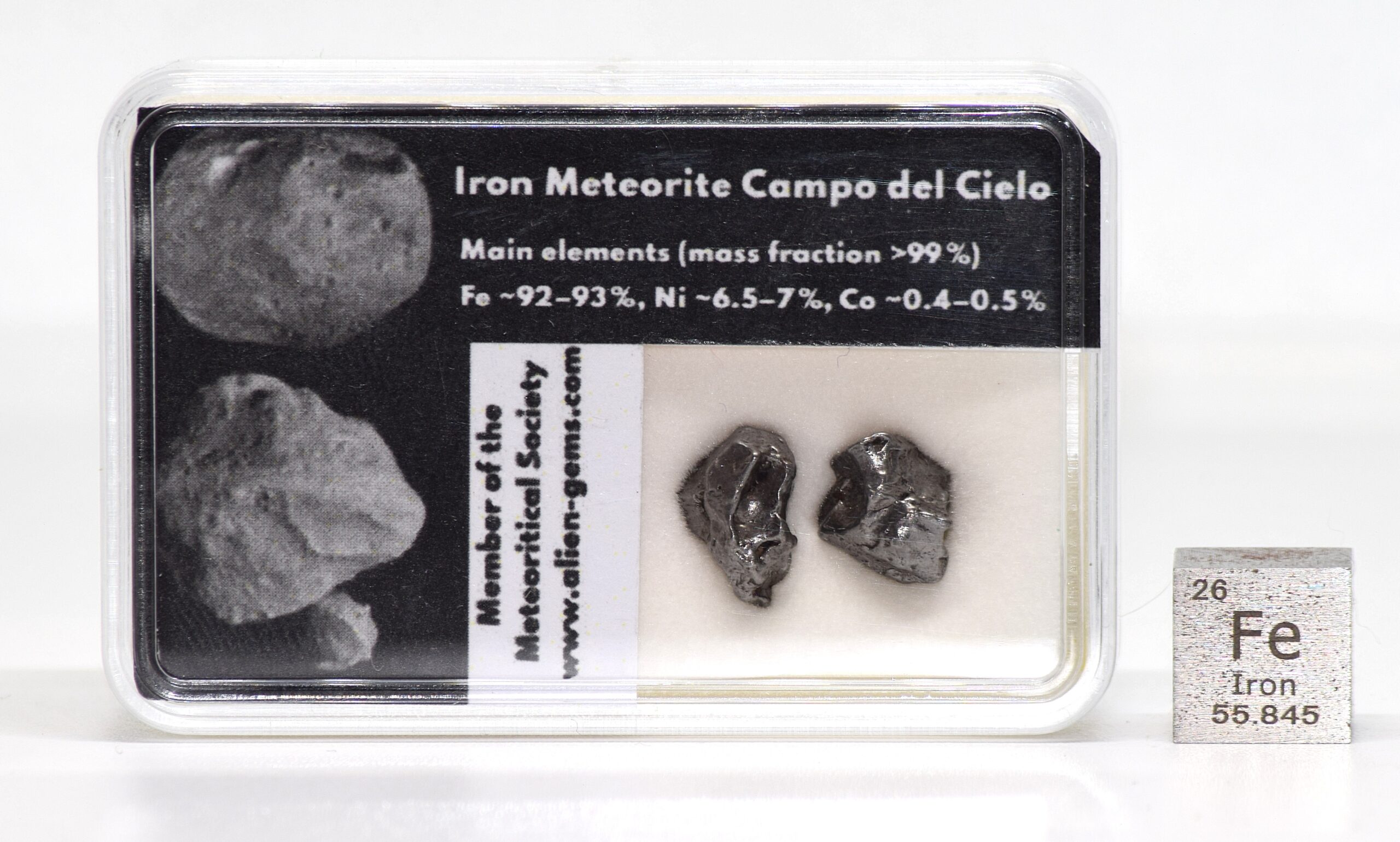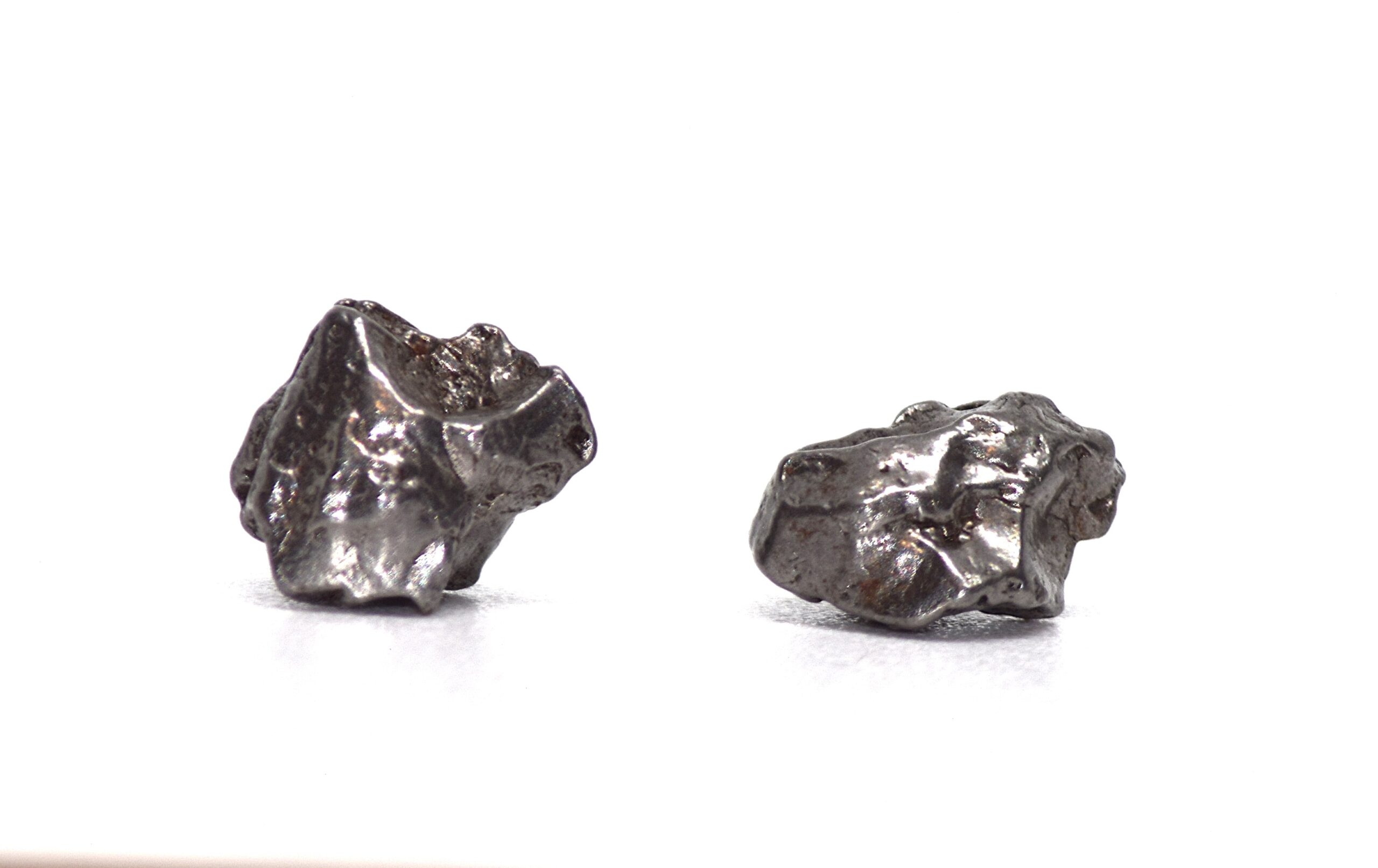 This Campo del Cielo iron meteorite set contains two genuine specimens recovered from the historic Campo del Cielo strewn field in Argentina and presented in a collector’s display box. The meteorites remain entirely natural and have not been cut, polished, or altered beyond minimal handling for display purposes. Together the two specimens have a total weight of 2.2 g.
