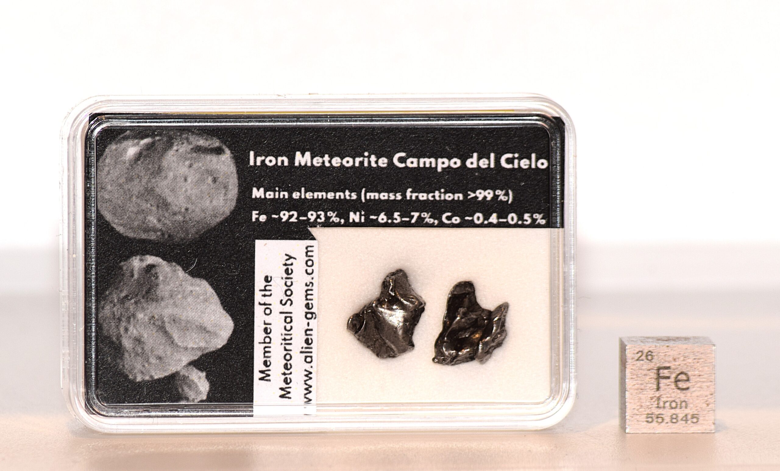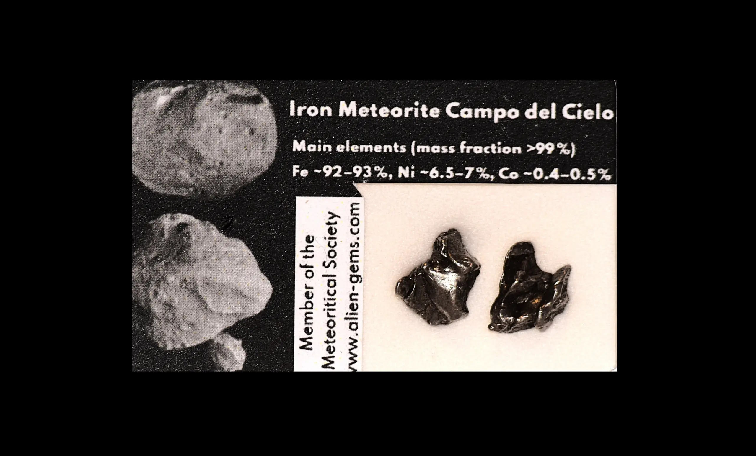 This Campo del Cielo iron meteorite set contains two genuine specimens recovered from the historic Campo del Cielo strewn field in Argentina and presented in a collector’s display box. The meteorites remain entirely natural and have not been cut, polished, or altered beyond minimal handling for display purposes. Together the two specimens have a total weight of 2.3 g.