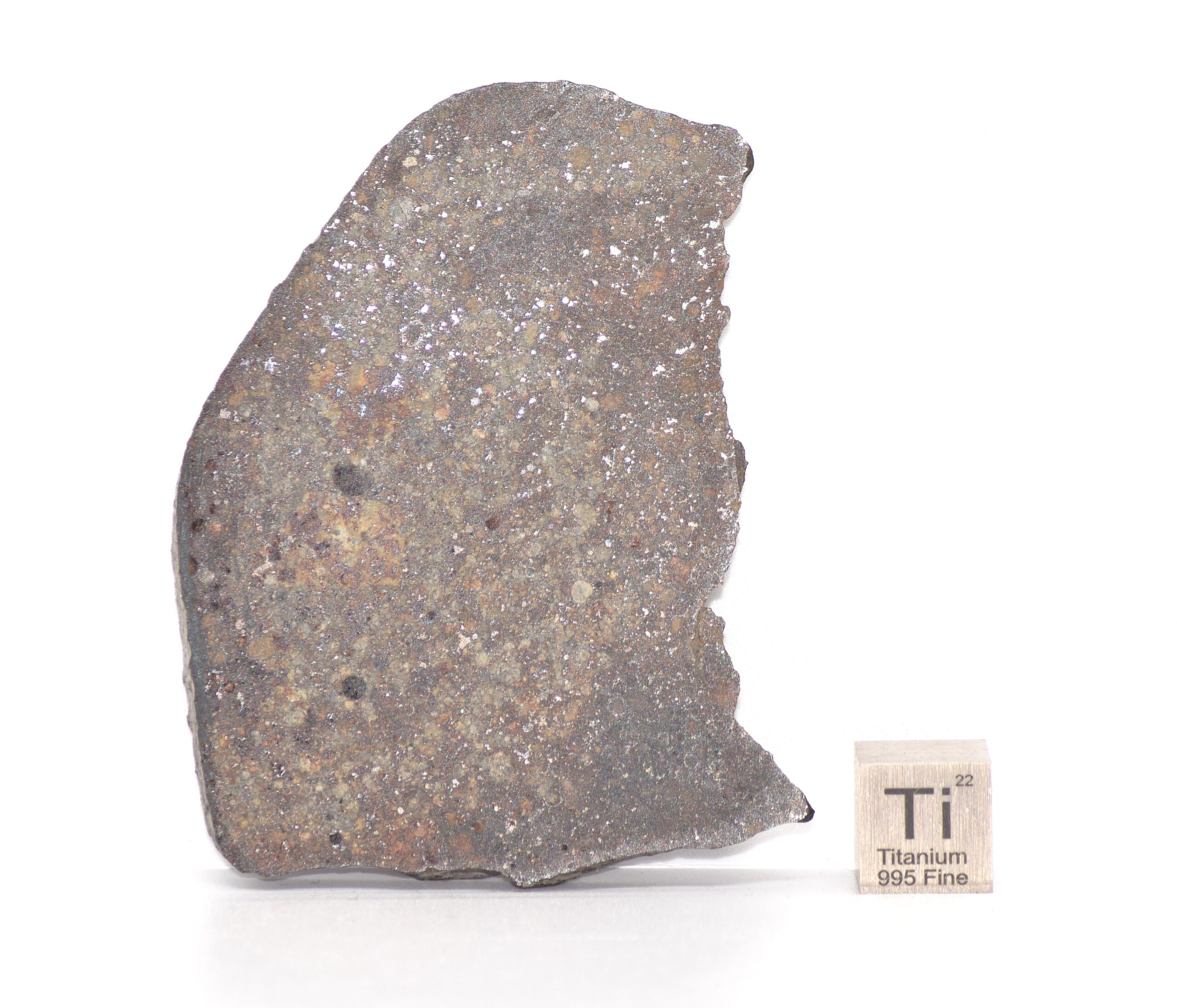 This meteorite slice is composed of multiple lithologies, reflecting a complex impact history on its parent body. The polished surface reveals abundant chondrules within a fine-grained matrix, as well as areas of free metal typical of L-group chondrites. Each chondrule represents early solid material from the protoplanetary disk, preserved from the earliest stages of solar system formation. Ordinary chondrites such as NWA 869 are among the oldest known solid materials, with an estimated formation age of approximately 4.55 billion years.
